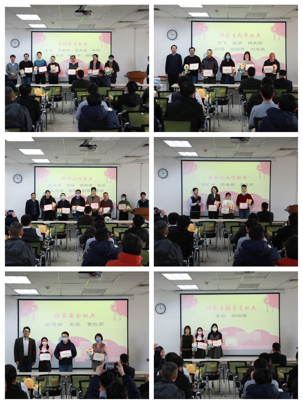 随后,公司领导班子成员共同为“本科教学标兵”、“研究生教学标兵”、“科研标兵”、“国际化标兵”、“保密安全标兵”、“行政服务标兵”、“本科生辅导员标兵”、“研究生辅导员标兵”获奖教师颁奖。