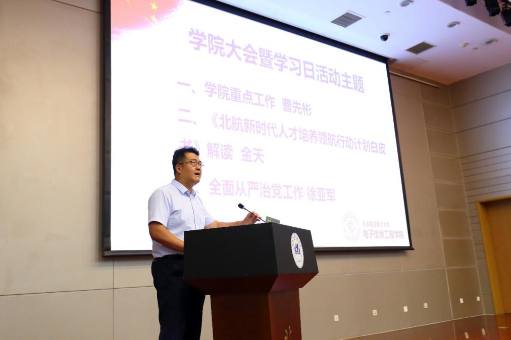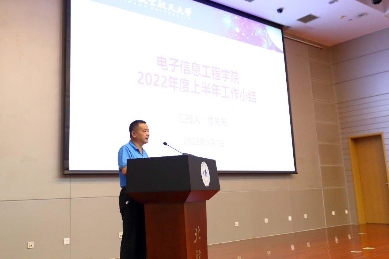 党委书记徐亚军传达公司2022年暑期工作会精神,梳理回顾了公司上半年全面从严治党工作取得的进展与成效。他指出,全院上下应当团结一心、统一思想、凝聚共识,共同努力开创公司内涵、特色、高质量发展的新局面,高水平推进“双一流”建设,以实际行动迎接党的二十大胜利召开、迎接北航七十周年校庆。
