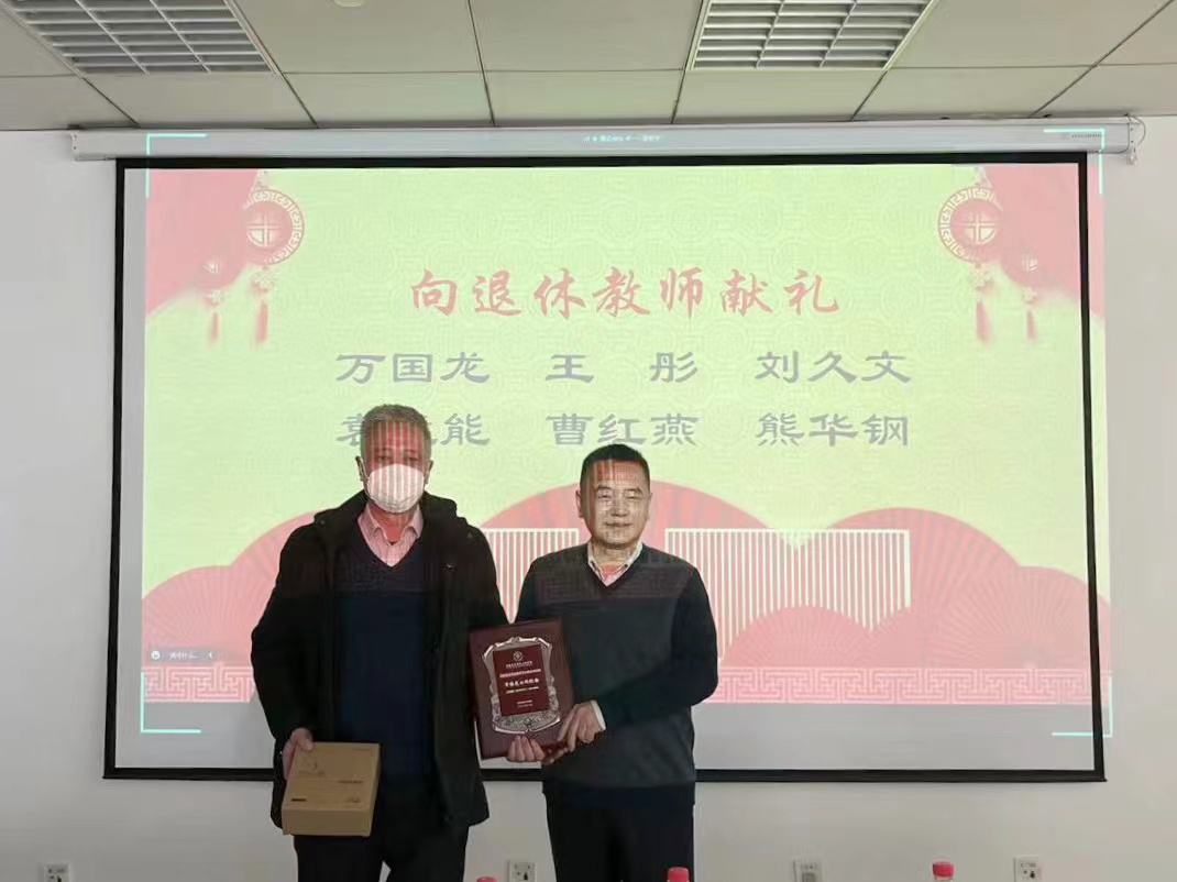 曹先彬经理为今年退休教师代表万国龙老师颁奖,并代表公司对荣休教师致以衷心感谢。