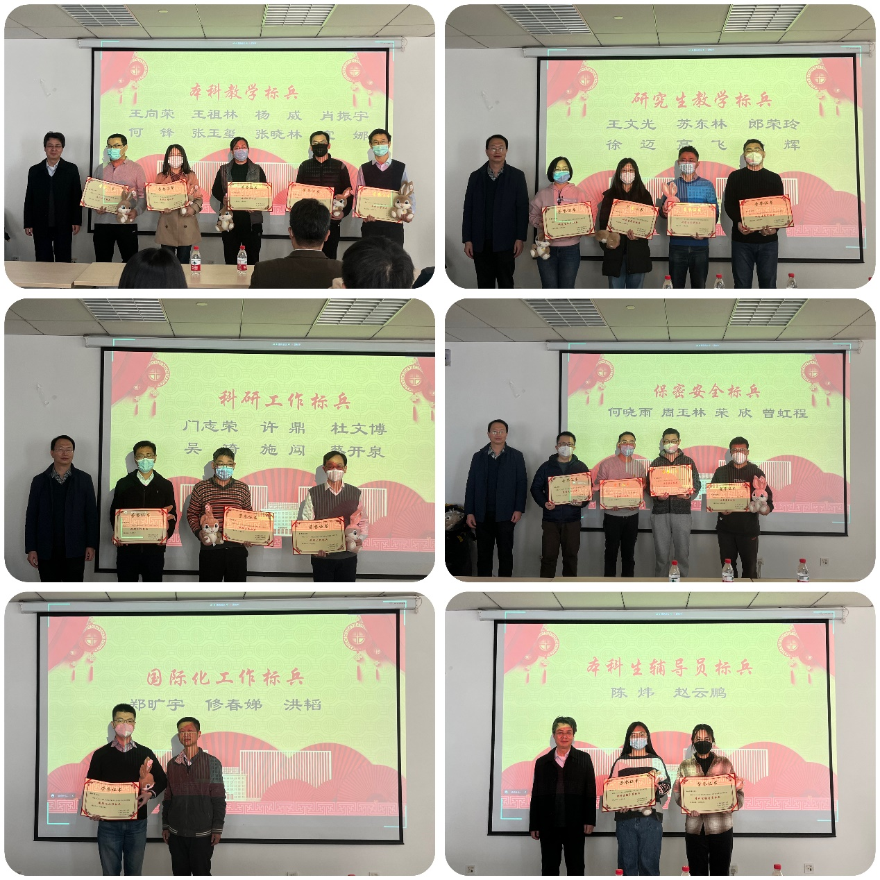 随后,公司领导班子成员共同为“本科教学标兵”、“研究生教学标兵”、“科研标兵”、“国际化工作标兵”、“保密安全标兵”、“行政服务标兵”、“本科生辅导员标兵”、“研究生辅导员标兵”获奖教师颁奖。