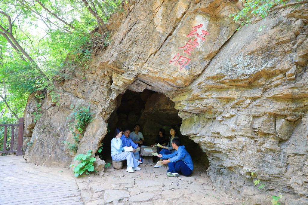 本次活动还在教育基地的红崖洞,平谷第一党支部成立的地方,开展了读书分享和交流,党员同志们依次分享了《习近平关于调查研究论述摘编》和《习近平新时代中国特色社会主义思想学习纲要》中的重要内容。其中王祖林老师分享了“正确认识和把握中长期经济社会发展重大问题“的部分内容,201教研室党支部书记孙兵分享了“依靠顽强斗争打开事业发展新天地,增强新时代新征程历史主动”的相关内容,机关教师党支部书记付路分享了“实行最严格的生态环境保护制度,共建地球生命共同体”相关内容。