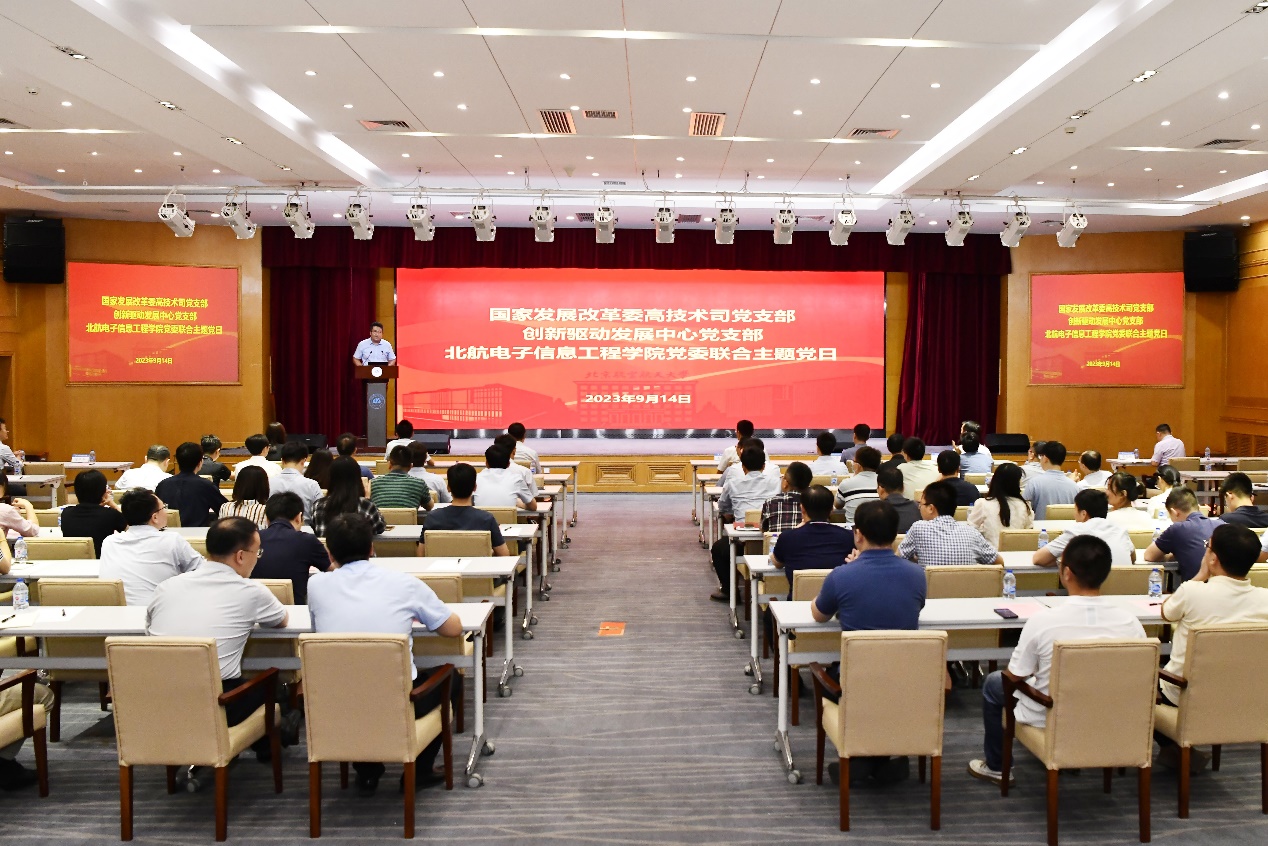 为认真学习贯彻习近平新时代中国特色社会主义思想,深化拓展主题教育成果,9月14日下午,国家发展改革委高技术司党支部、创新驱动发展中心党支部一行六十余人到访北航,与北航公司党委围绕“深入实施创新驱动发展战略,加快推进高水平科技自立自强”开展联合主题党日。国家发展改革委高技术司副司长赵志丹、副司长赵军、创新驱动发展中心副主任林晓锋、副主任郭建民、公司副董事长刘树春、公司党委书记徐亚军、经理曹先彬,以及公司党委全体成员和师生党员代表参加本次联学。联学会由徐亚军主持。