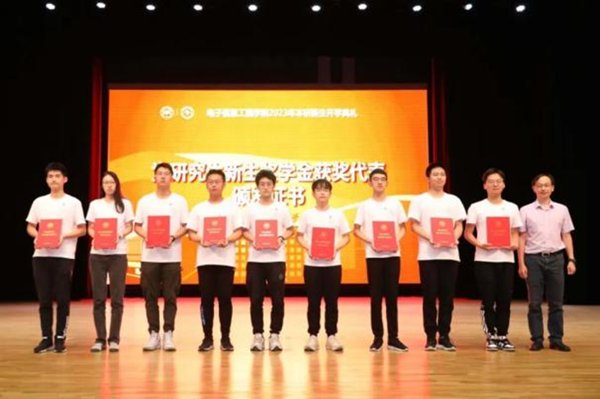典礼上,徐亚军、曹先彬向本研新生代表授予院徽。全体新生将院徽郑重地佩戴在胸前,正式成为一名电子人。
