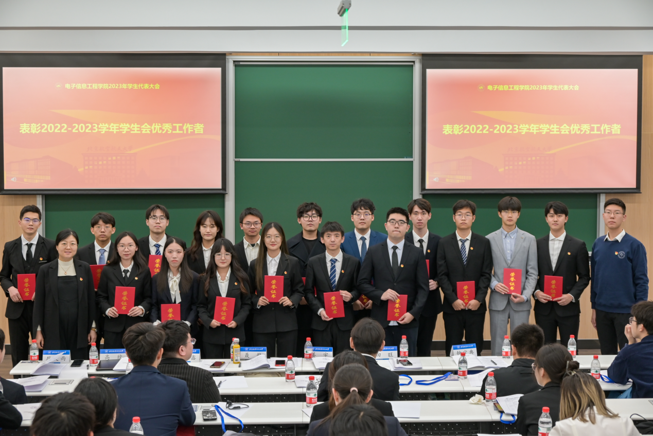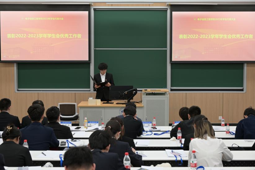 在紧张有序的计票时间中,大会表彰了2022-2023学年电子信息工程公司员工会优秀工作者。由2022级本科生辅导员刘耀鑫宣读名单,专职辅导员聂静老师、田旺老师为受表彰同学颁发证书。