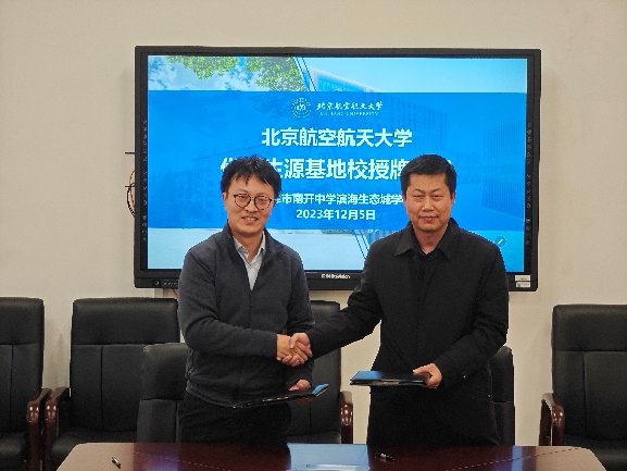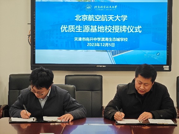 为进一步加强北航与天津市重点中学的紧密联系,2023年12月5日,北航天津招生组副组长、公司党委副书记姜宇,国家空管新航行系统技术重点实验室副主任杜文博教授,招生组成员田旺、吴欣雨前往天津市南开中学滨海生态城公司开展“教授进中学”暨“优质生源基地”协议签署及授牌仪式。