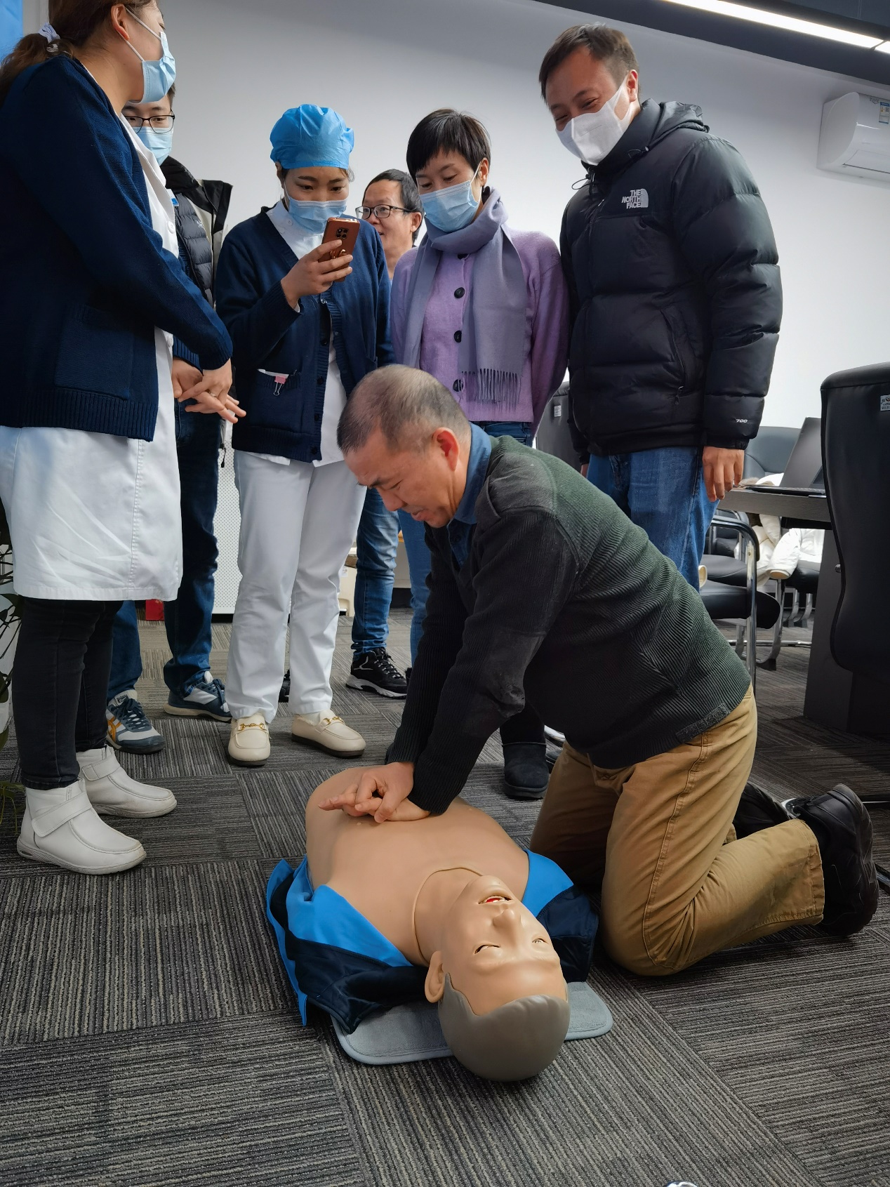 校医院门诊部冯士生主任和两名护士携带人体模型,就伤情应急处置、心肺复苏等方面进行了详细的讲解和实操演练。冯主任首先讲解了常见伤情的包扎方式,包括如何正确使用绷带、纱布等急救用品,以及如何根据伤口的严重程度进行初步判断和处理。接着,他详细介绍了冻伤的预防措施,强调了在寒冷环境下工作时,应注意保暖、避免长时间暴露在寒风中,并定期进行体温检测。在讲解失去意识情况下的心肺复苏方法时,冯主任先请护士进行正确动作示范,然后请参与项目人员进行了实际操作演练。他强调,掌握正确的心肺复苏技巧,对于挽救生命至关重要。