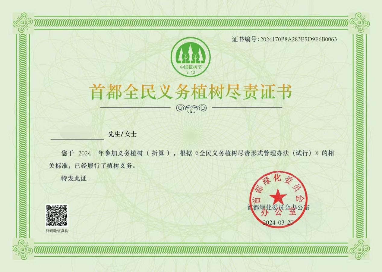 活动圆满结束,每一位参与者都获得了一份首都全民义务植树尽责证书,这是对同学们育树劳动的一份纪念,更是对同学们环境意识的强化与肯定。